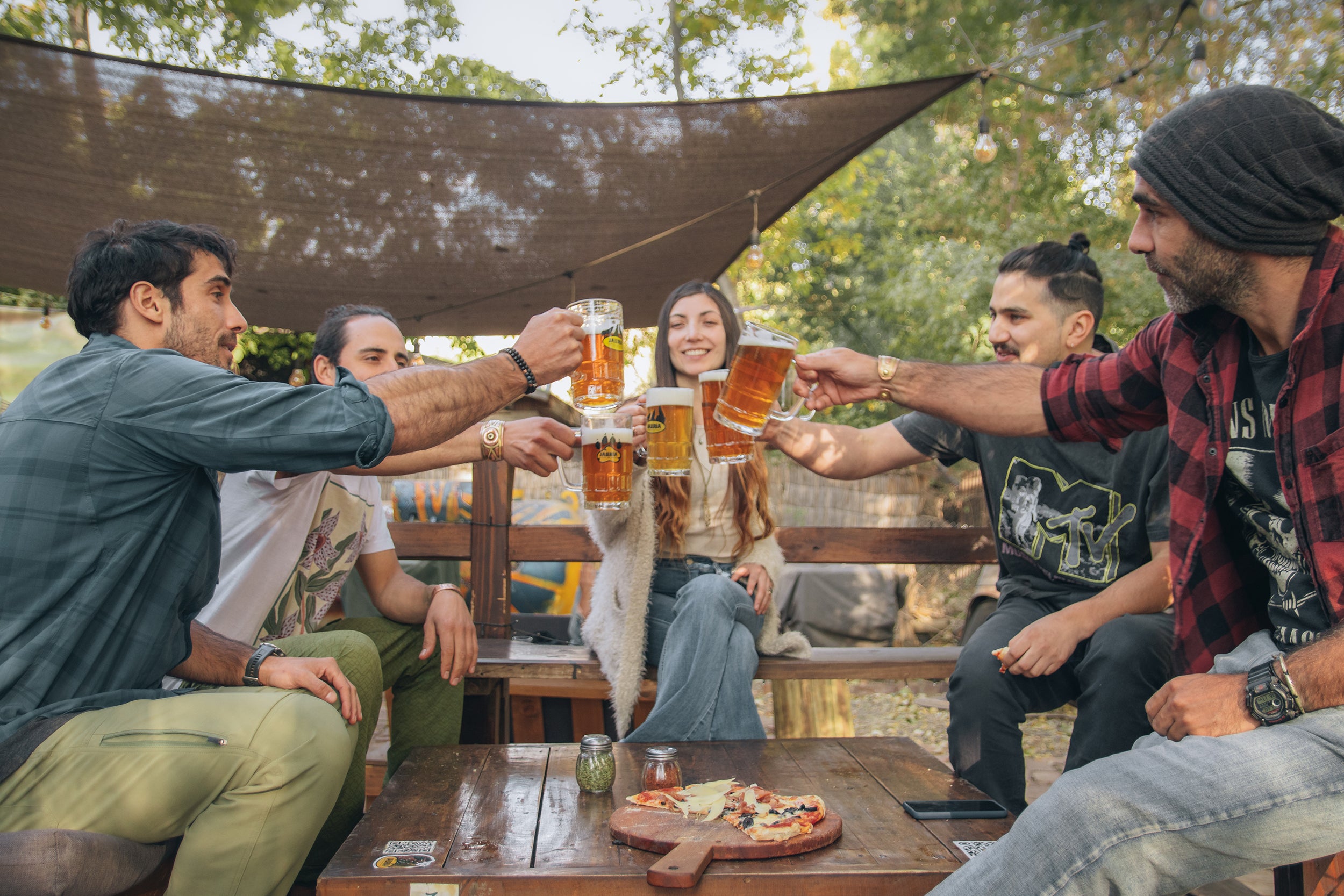 Masa a la piedra, mozarella pomodoro, toques de queso vegano, champiñones, cebolla caramelizada y rúcula